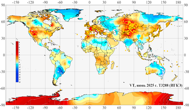 В целом для суши Земного шара, июнь 2025 г. стал третьим самым теплым в ряду наблюдений с 1901 г., с аномалией температуры +0,527оС (после двух последовательных рекордов: июнь 2024 г., +0,816оС - последний рекорд; июнь 2023 г., +0,612оС – предыдущий рекорд).