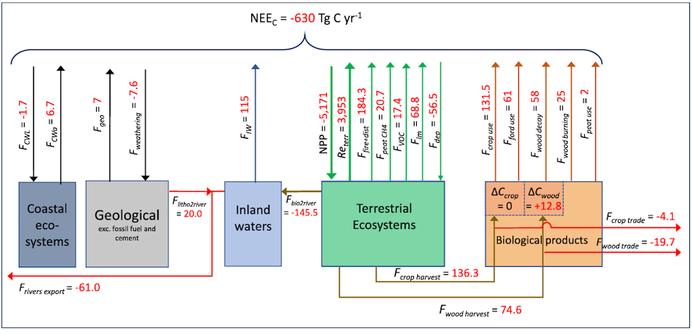 Так, в статье (Romanovskaya, Korotkov, 2024) оценки чистого поглощения природными экосистемами России по состоянию для 2016 года составили 1,1 ± 1,7 млрд т CO2-экв. в год. Исследование показывает, что если учитывать только CO2, чистое поглощение наземными экосистемами России соответствует более чем -2,5 млрд тонн CO2 (0,68 млрд т С в год), при этом примерно 35% приходится на вклад лесов. Однако с учетом выбросов ПГ, отличных от CO2, общее чистое поглощение природными экосистемами России сокращается примерно до -1,0±1,8 млрд т CO2-экв. в год (при этом вклад лесов увеличивается до 80%). При учете как природных, так и антропогенных потоков общий баланс ПГ в России соответствует чистым выбросам в атмосферу в размере 1,0 ± 1,7 млрд т CO2-экв. в год.