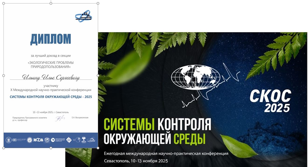 По результатам проведения 10-й юбилейной ежегодной международной научно-практической конференции с участием стран АСЕАН и БРИКС «Системы контроля окружающей среды – 2025» (СКОС-25, 10-13 ноября 2025 г.) организаторы наградили ведущего научного сотрудника отдела оценки загрязнения окружающей среды (лаборатория 1) ИГКЭ, к.г.н. Ильина Илью Сергеевича дипломом за лучший доклад, представленный на секции «Экологические проблемы природопользования».