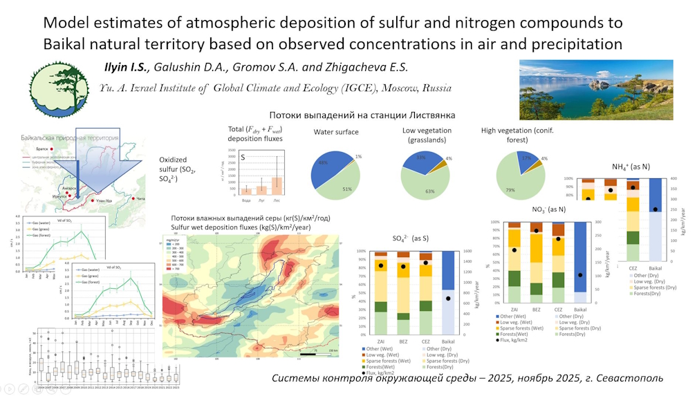 Представленное сообщение (онлайн доклад) «Модельная оценка поступления соединений серы и азота из атмосферы на Байкальскую природную территорию на основе данных измерений концентраций в воздухе и осадках» было подготовлено в соавторстве с сотрудниками ФГБУ «ИГКЭ» Галушиным Д.А, Громовым С. А. и Жигачёвой Е.С. по результатам обработки данных ЕАНЕТ и сети мониторинга химического состава осадков с использованием моделирования потоков выпадений кислотообразующих веществ из атмосферы.