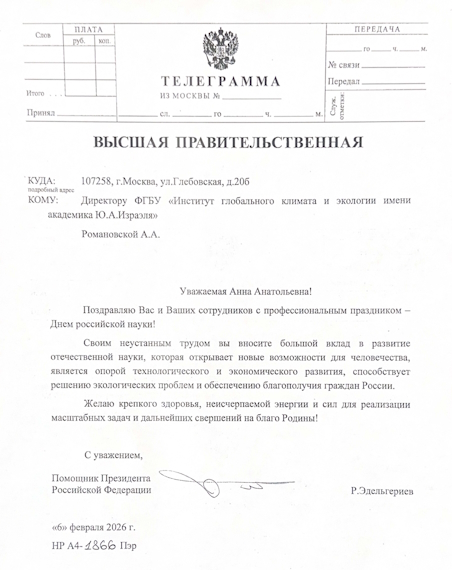Поздравление директору ФГБУ “ИГКЭ” Романовской А.А. от Помощника Президента Российской Федерации Р. Эдельгериева с Днем российской науки (ВЫСШАЯ ПРАВИТЕЛЬСТВЕННАЯ ТЕЛЕГРАММА)
