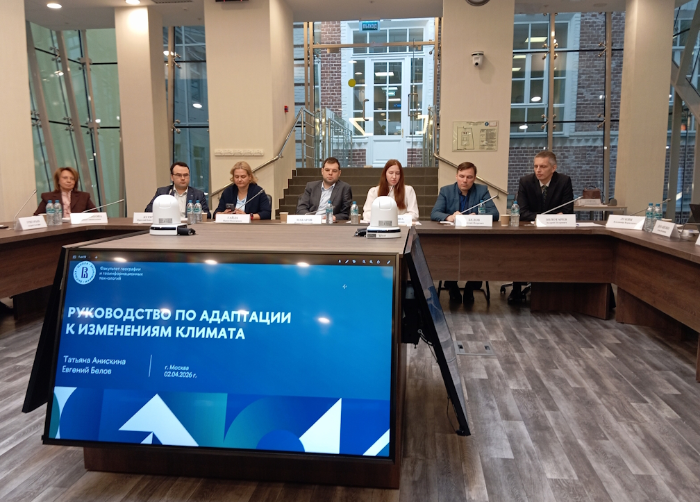 Руководство по адаптации к изменениям климата представили его авторы: Анискина Татьяна Андреевна, директор Центра геоданных, заместитель декана ФГГТ НИУ ВШЭ и Белов Евгений Игоревич, менеджер по управлению климатическими рисками ПАО «Северсталь», эксперт в области адаптации к изменениям климата, ассоциированный партнер ФГГТ НИУ ВШЭ, научный сотрудник ИГКЭ.