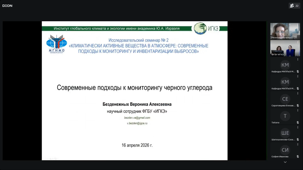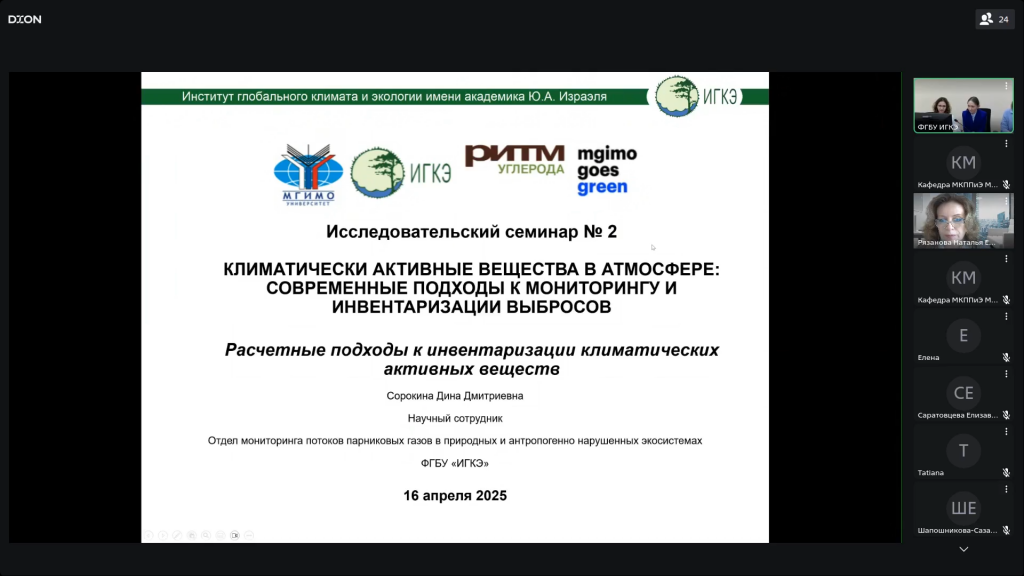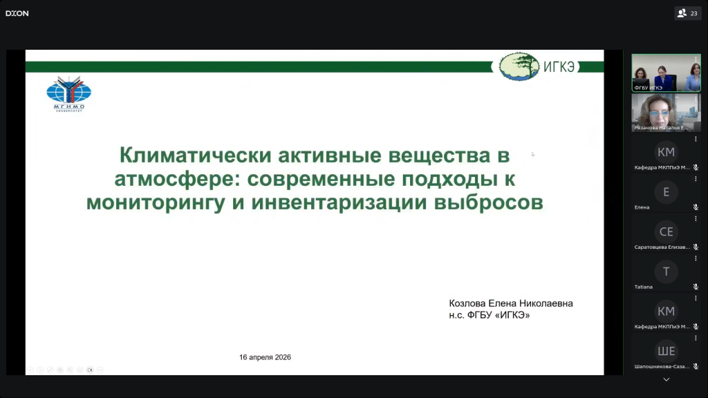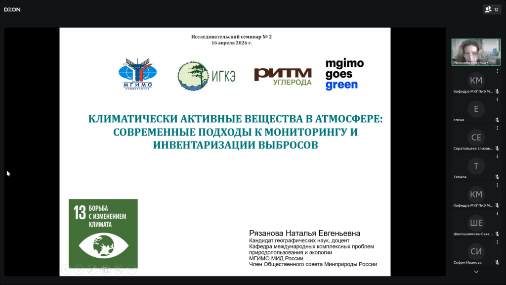 16 апреля 2026 года в онлайн-формате прошел исследовательский семинар № 2 «Климатически активные вещества в атмосфере: современные подходы к мониторингу и инвентаризации выбросов», организованный кафедрой международных комплексных проблем природопользования и экологии МГИМО МИД России.