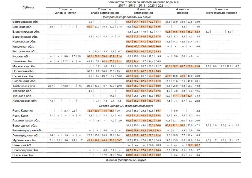 | Субъект РФ | Водный объект | Класс качества воды в 2020 г. | Тенденция изменения качества воды |