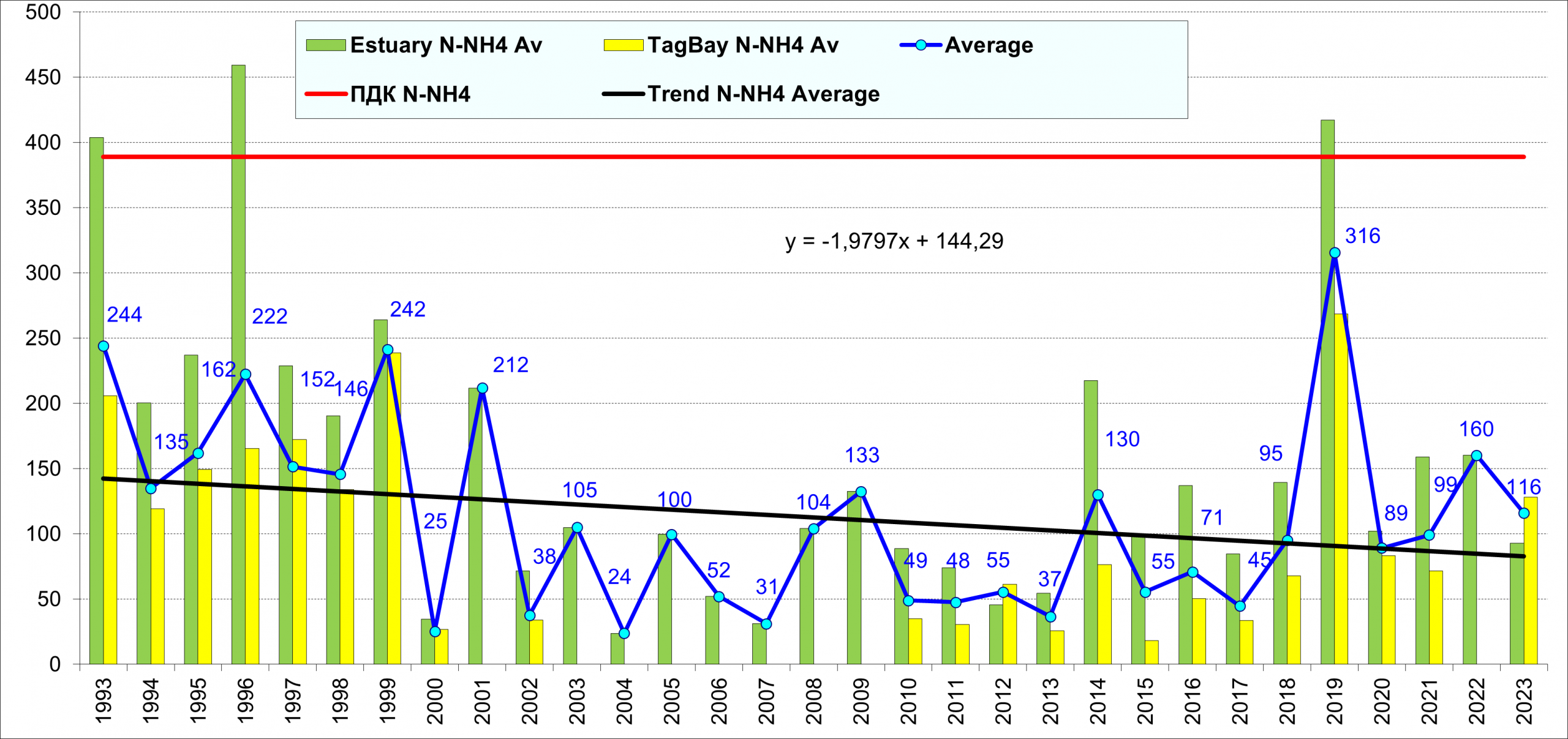 С начала 1990-х до начала 2000-х годов наблюдалась тенденция снижения среднегодовой концентрации аммонийного азота в устье р. Дон и восточной части Таганрогского залива. Затем наступила десятилетняя относительная стабилизация на пониженных значениях. В 2019 г. был зафиксирован пик содержания аммонийного азота, после которого значения вернулись к среднемноголетним.