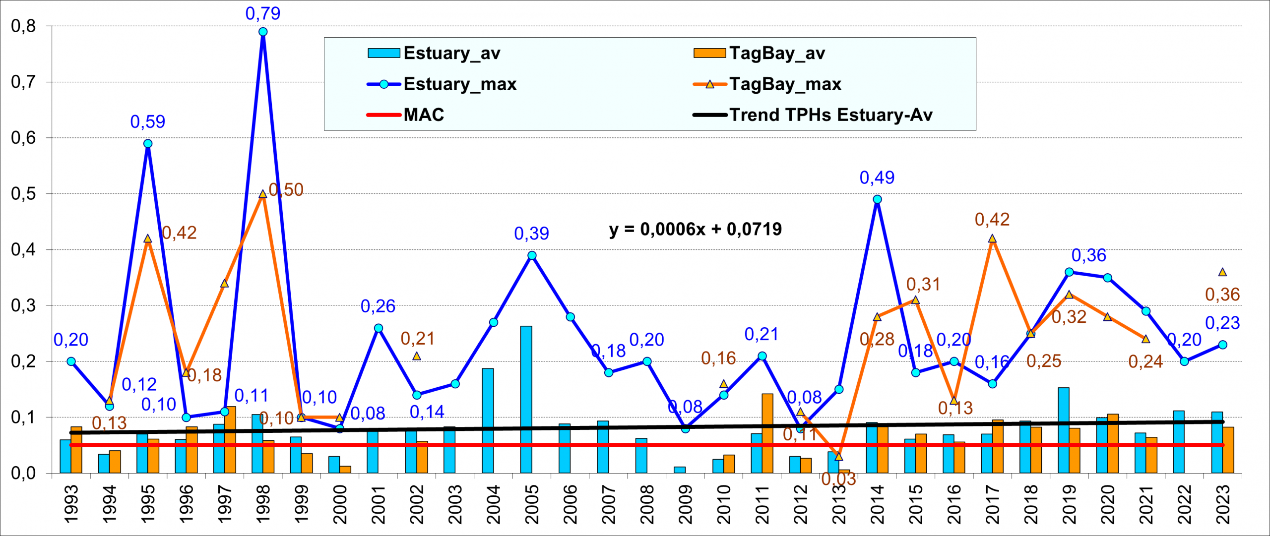 В течение всего периода наблюдений уровень загрязнения устьевой области р. Дон остается стабильно высоким. За исключением 5 лет (2000, 2009-2010 и 2012-2013 гг.) среднегодовая концентрация постоянно превышала ПДК, а в 2023 г. и в Таганрогском заливе, и в устье Дона – 2 ПДК. Максимальная концентрация за весь период наблюдений была в диапазоне 2-16 ПДК, с тенденцией небольшого понижения к 2022-2023 гг.