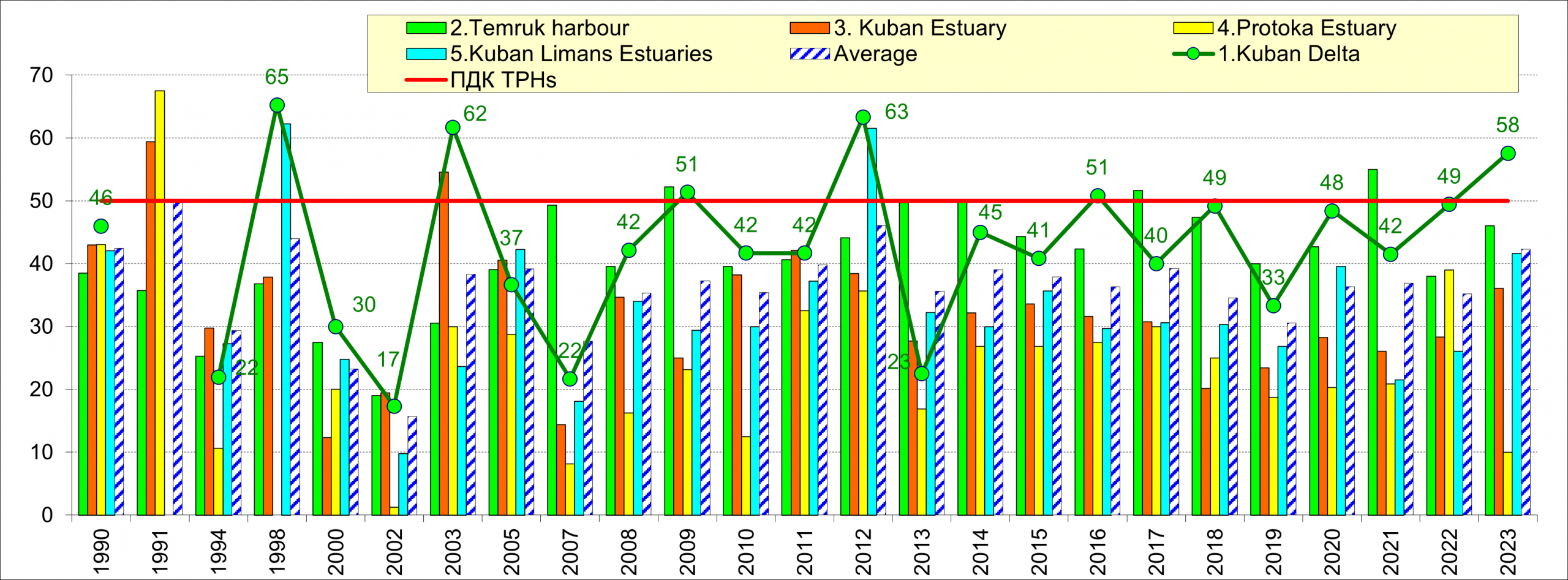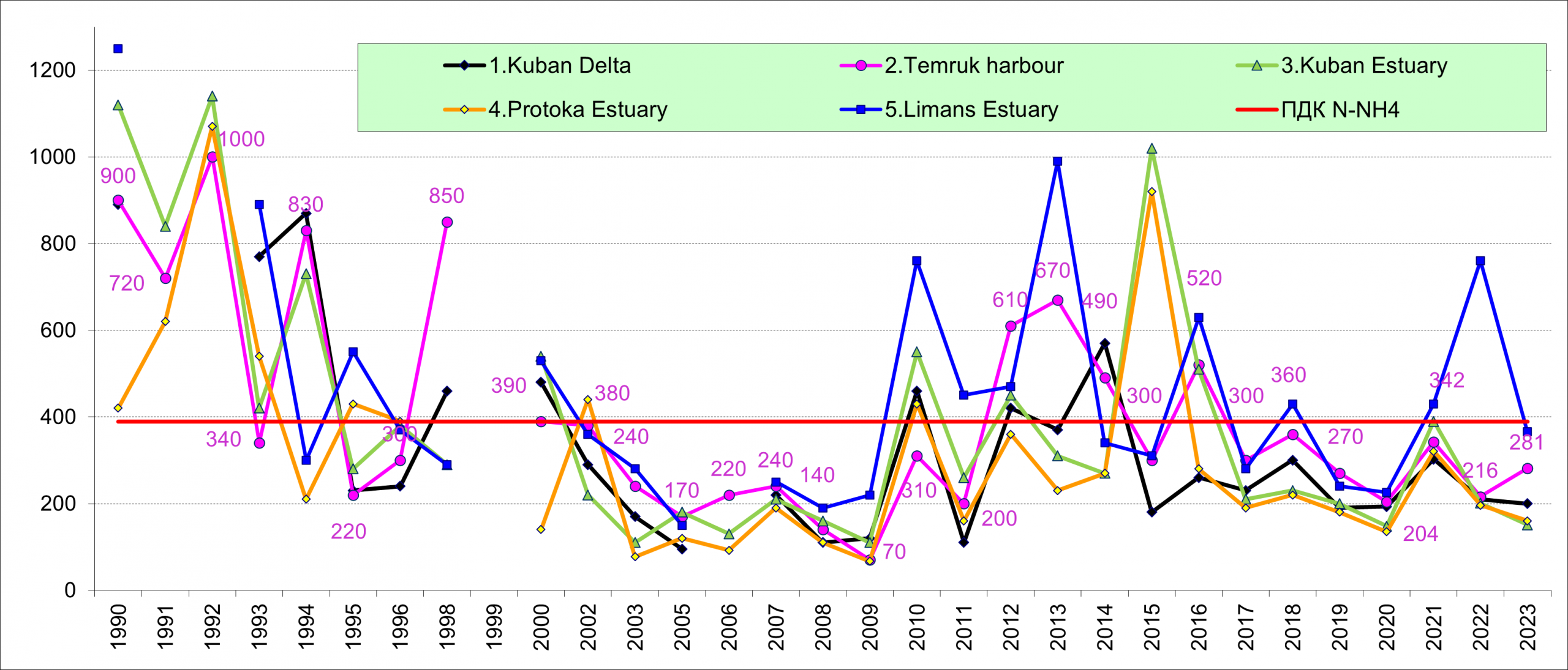 В устье р. Кубань и Темрюкском заливе содержание аммонийного азота зачастую превышало ПДК. Очень высокими значения были в 1990-1995 гг. и 2010-2016 гг., а позднее в основном (кроме скачка в 2022 г. в устьевых зонах лиманов) оставались в пределах нормы.