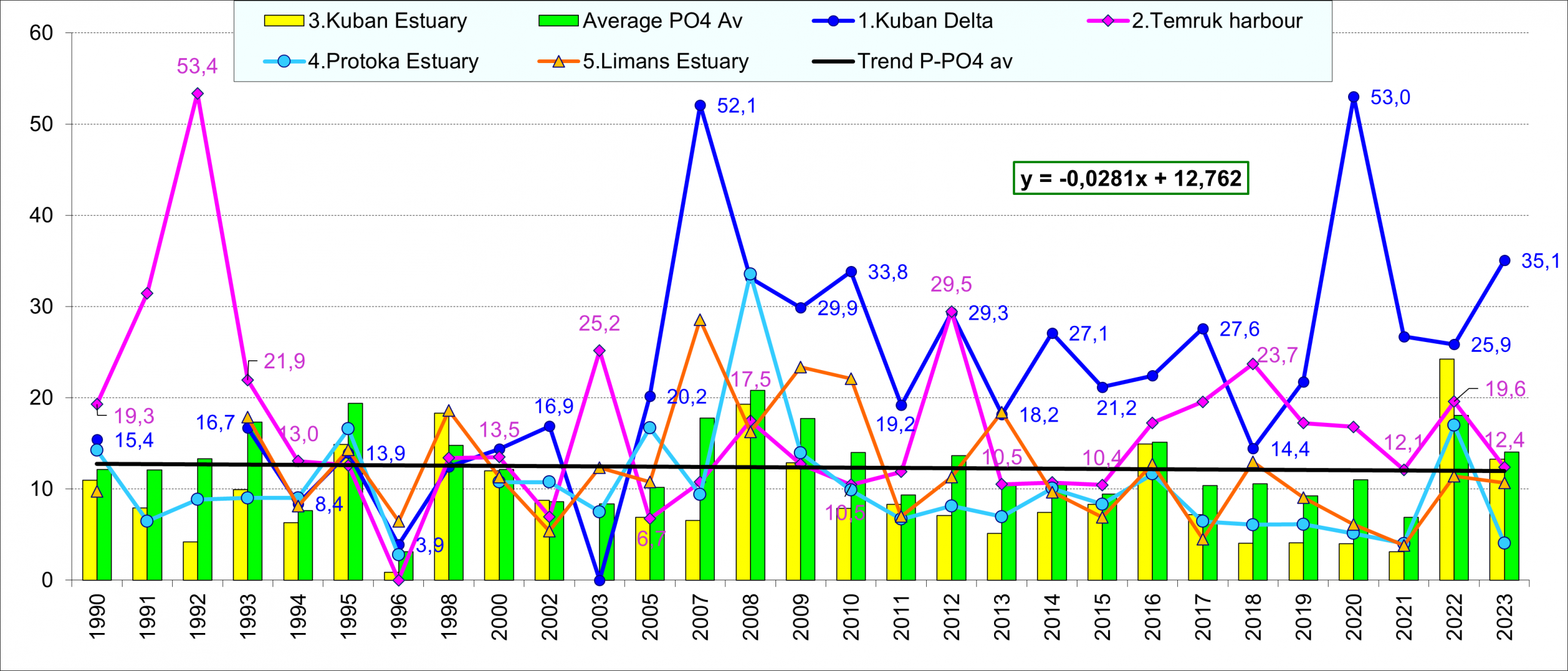 Фосфаты являются приоритетным загрязнителем в водах дельты Кубани. В 2007 и 2020 гг. их концентрация превышала ПДК, а в последние три года она снизилась на приустьевых участках реки в обоих рукавах. Межгодовая вариабельность очень высокая, а суммирующий для всех районов тренд на понижение очень незначительный и составляет менее 0,03 ед. в год.