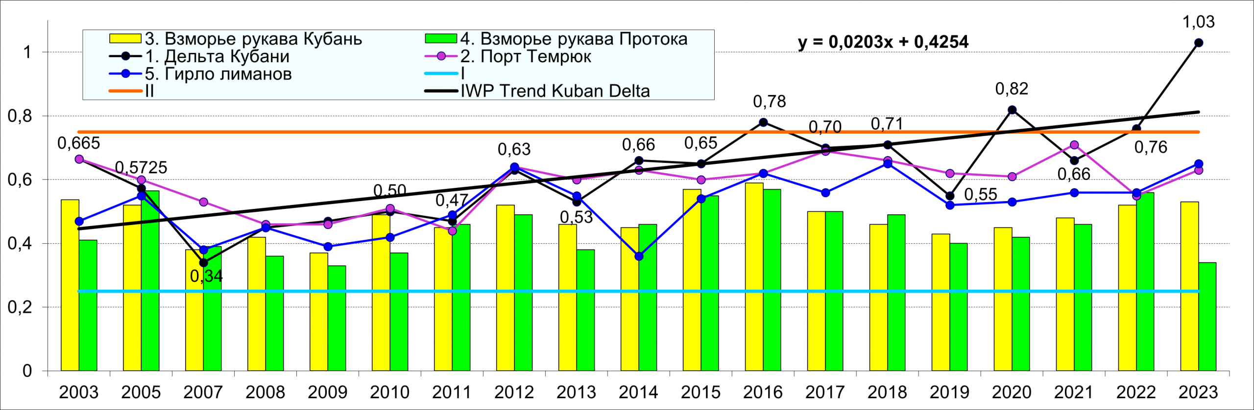 ИЗВ отдельных участков наблюдений в Темрюкском заливе остается в пределах II класса, «чистые». В целом, к 2023 г. отмечался тренд ухудшения качества вод практически на всех участках, особенно в дельтовых рукавах Кубани, где ИЗВ в 2016, 2020 и 2023 гг. находился в III классе качества вод, «умеренно загрязненные».