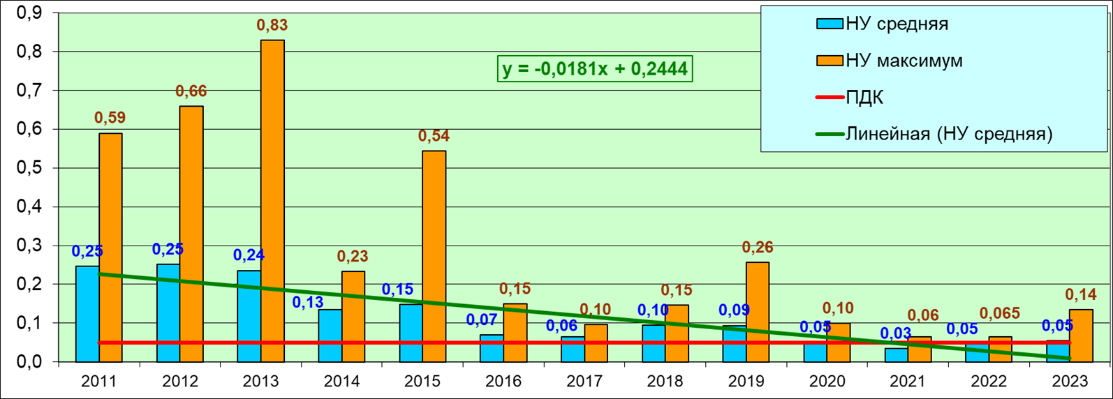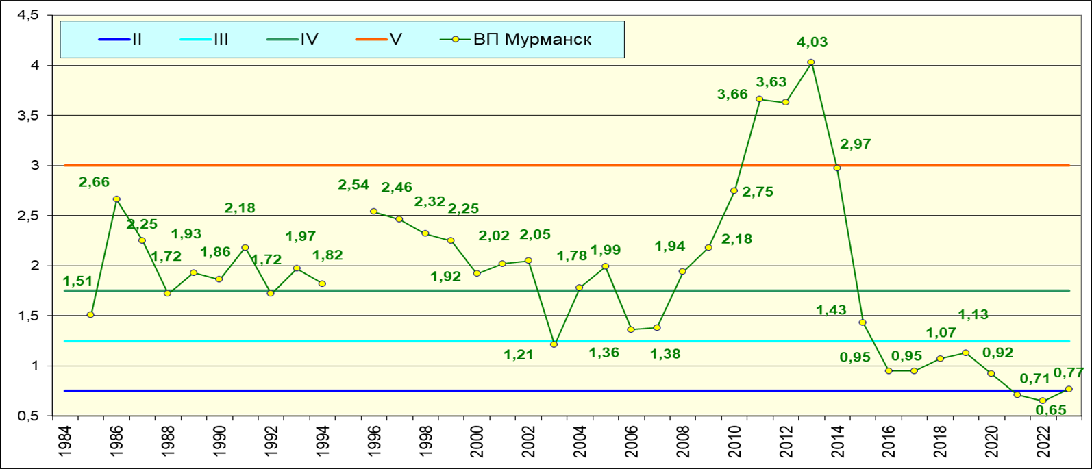 Содержание нефтяных углеводородов на водпосту в торговом порту Мурманска в 2023 г. несколько повысилось в сравнении с предыдущим годом, нарушая тенденцию уменьшения содержания НУ в водах Кольского залива вблизи поста ВПМ. Анализ многолетней динамики также показал небольшое повышение средней концентрации – 1,10 ПДК против 1,03 ПДК в 2022 г. Ниже ПДК среднегодовая концентрация впервые за историю наблюдений была только в 2021 г.