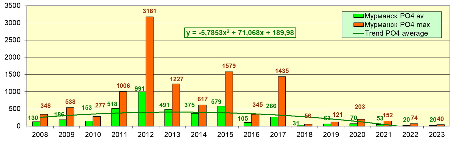По сравнению с прошлым годом максимальная концентрация фосфатов стала ниже почти в 2 раза, среднегодовое значение осталось на том же уровне. Сохраняется тенденция снижения содержания биогенных элементов в морской воде вблизи водпоста в торговом порту г. Мурманска.