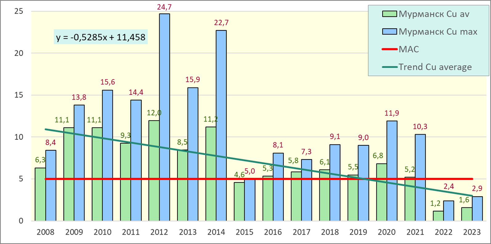 В 2022-2023 гг. содержание меди не превышало ПДК, причем не только средние, но и максимальные значения. В предыдущие годы, особенно в 2008-2014 гг., содержание меди значительно превышало ПДК.