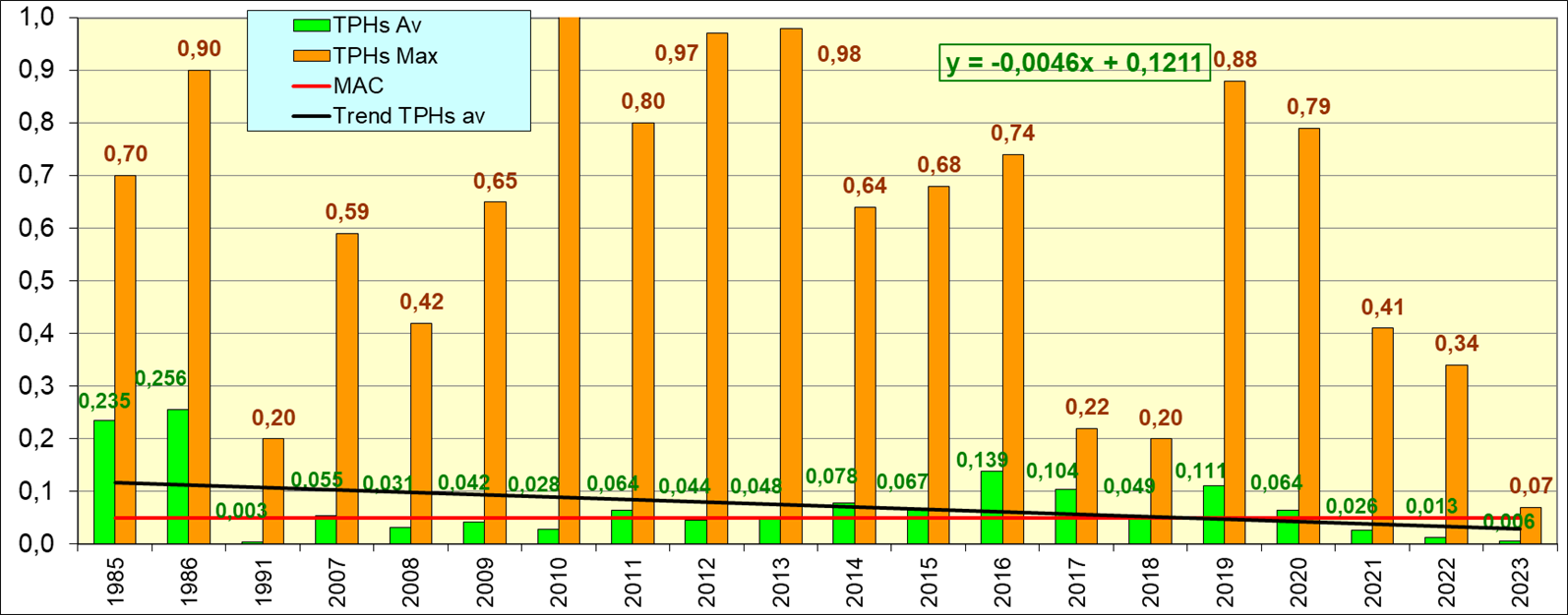Динамика среднегодового и максимального содержания нефтяных углеводородов (мг/дм3)