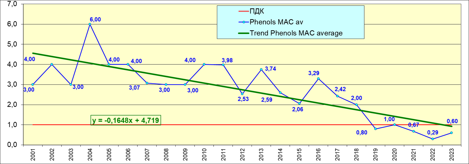 Динамика среднегодовой концентрации фенолов, в единицах ПДК
