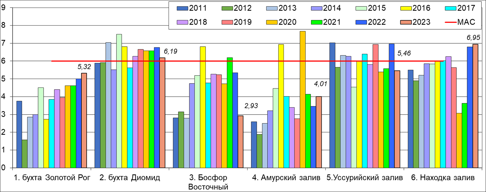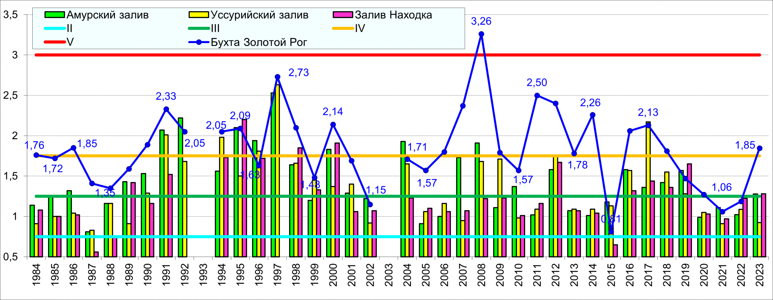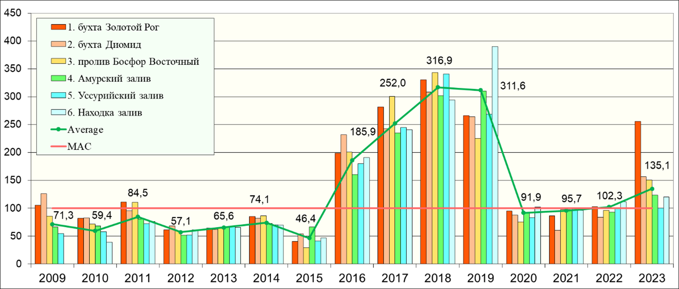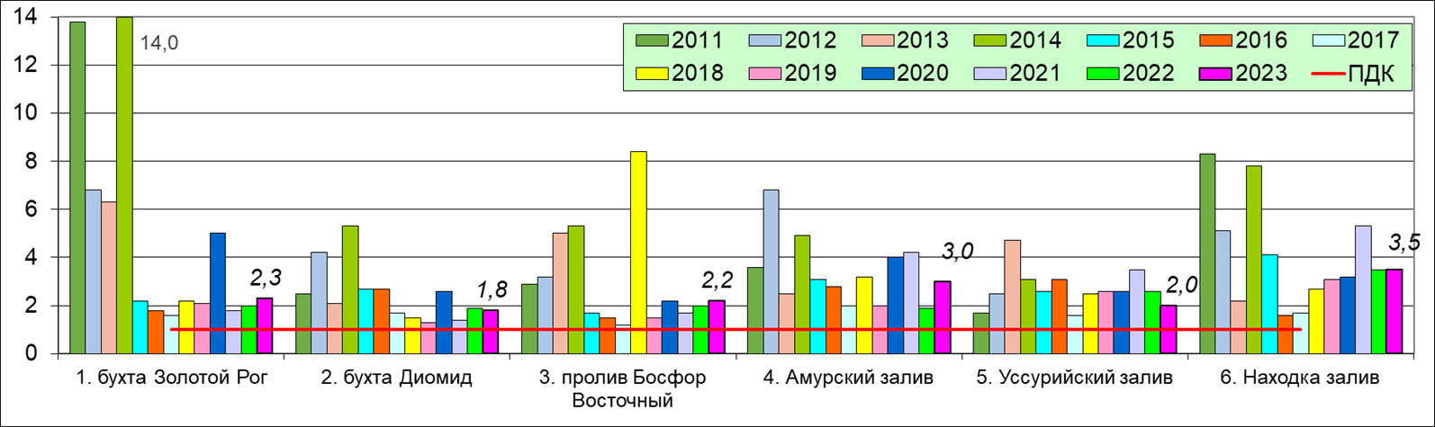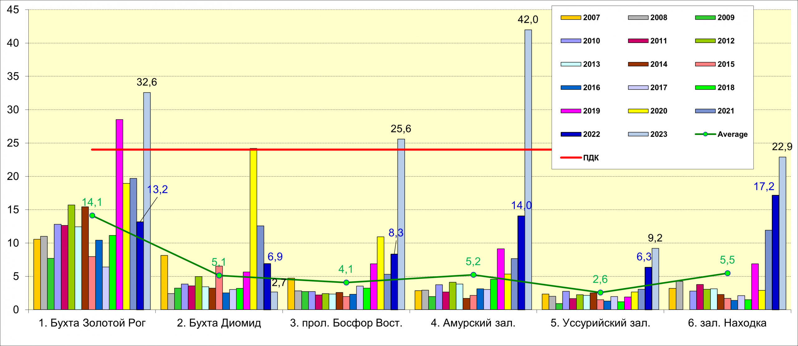 Во всех прибрежных районах залива Петра Великого с 2016 по 2019 г. наблюдался резкий рост уровня загрязненности морских вод синтетическими поверхностно-активными веществами по сравнению со всеми предыдущими годами наблюдений. В 2020-2022 годах этот процесс остановился во всех районах, и среднегодовой показатель не превышал 1 ПДК. После 2023 г. произошло повышение, особенно значительное в бухте Золотой Рог – до 2,5 ПДК.