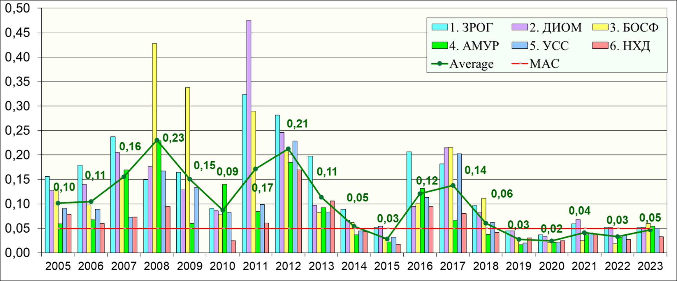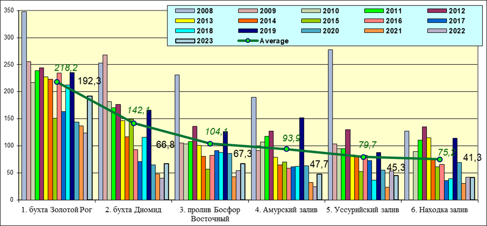 Среднегодовое содержание НУ в морской воде с 2019 г. существенно снизилось и перестало превышать ПДК до 2022 г. во всех районах, кроме Золотого Рога и бухты Диомид. В последний год среднее значение составило 1 ПДК. Несмотря на значительную многолетнюю цикличность в уровне загрязнения НУ, общий тренд за последние 14 лет показывает уверенное снижение средней концентрации нефтяных углеводородов.