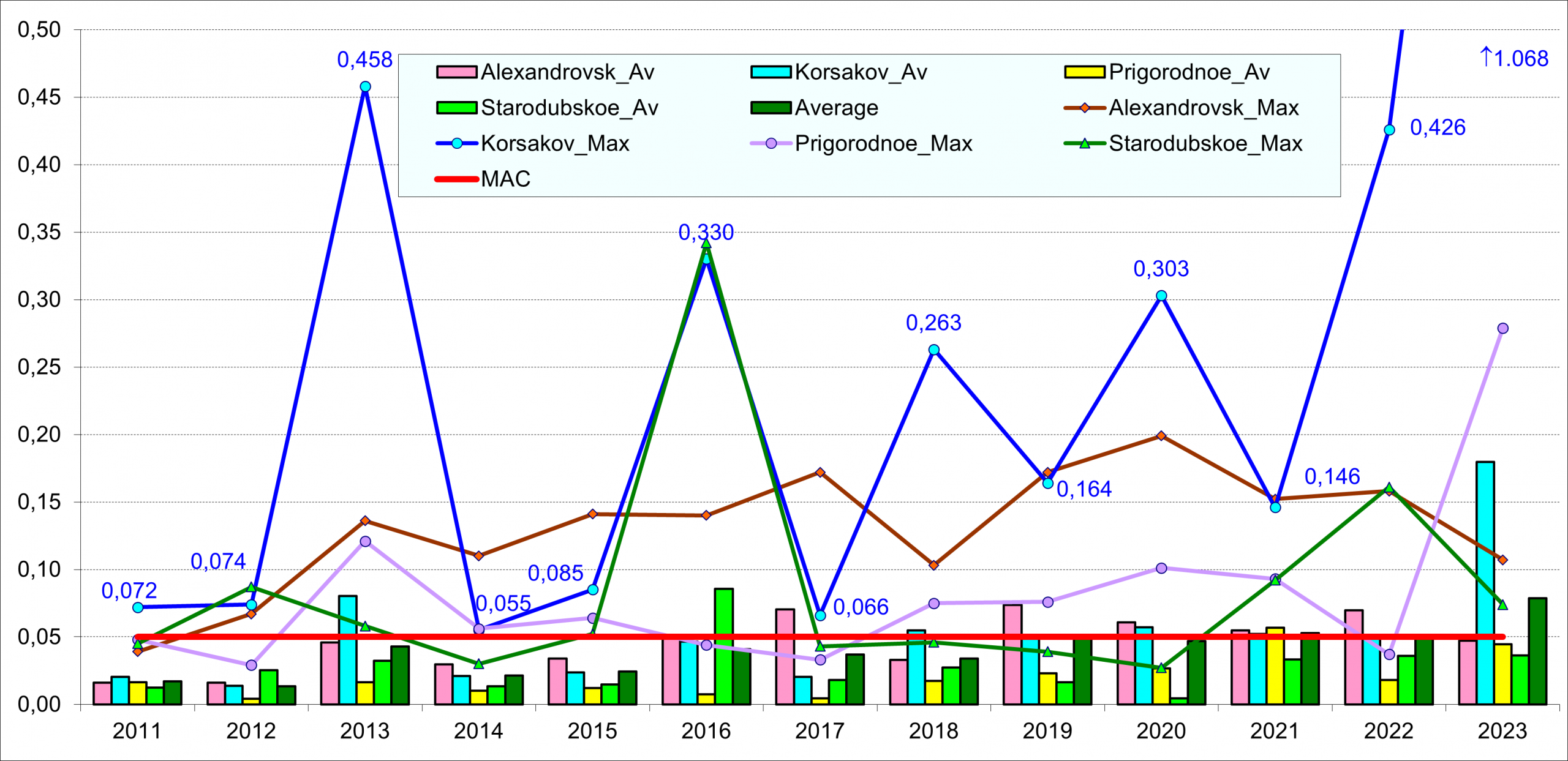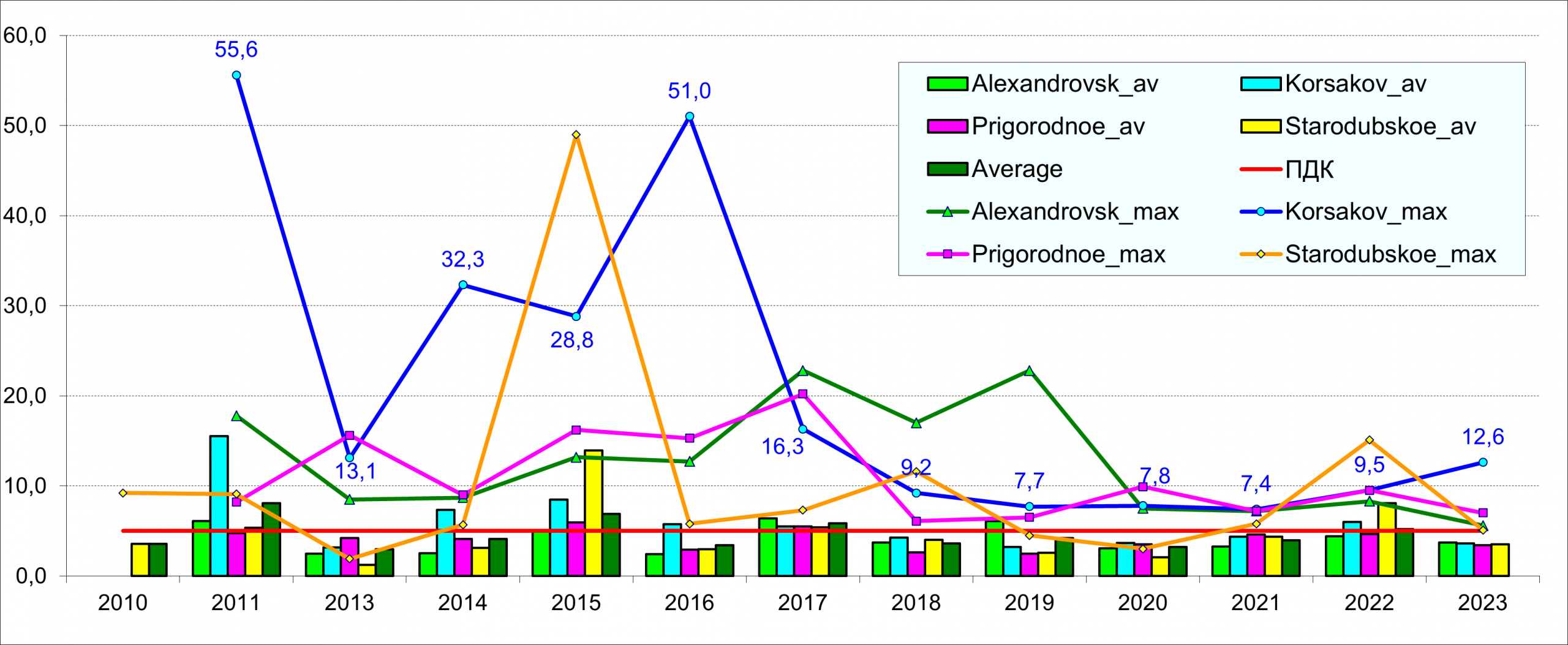 Концентрация меди в 2023 г. снизилась в Стародубском, Александровске, Пригородном, но повысилась в Корсакове. В 2021 г. по сравнению с 2018-2020 гг. повысились значения средней и максимальной концентрации меди: средняя составила 4,4 мкг/дм3; максимальная 5,8 мкг/дм3 (1,2 ПДК).
