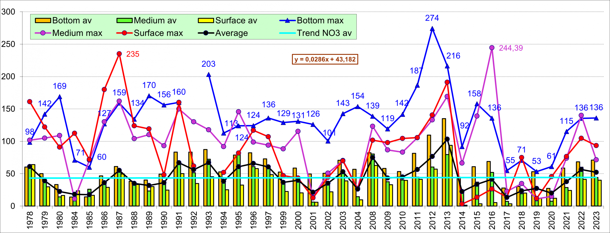 Концентрация биогенных элементов в водах залива в 2023 г. была примерно на уровне средних многолетних значений. На протяжении многих лет максимальные значения нитратов на дне были обычно выше, чем на поверхности или в среднем слое. Наибольшие среднегодовые и максимальные значения содержания нитратов практически всегда наблюдались в придонном слое: самая высокая концентрация была зафиксирована в 2012 г. и составила всего 0,03 ПДК. За весь сорокапятилетний период наблюдений среднегодовая концентрация нитратного азота практически не изменилась и линейный тренд этого показателя не выявлен. В то же время наблюдаются существенная межгодовая изменчивость и средних, и экстремальных значений.
