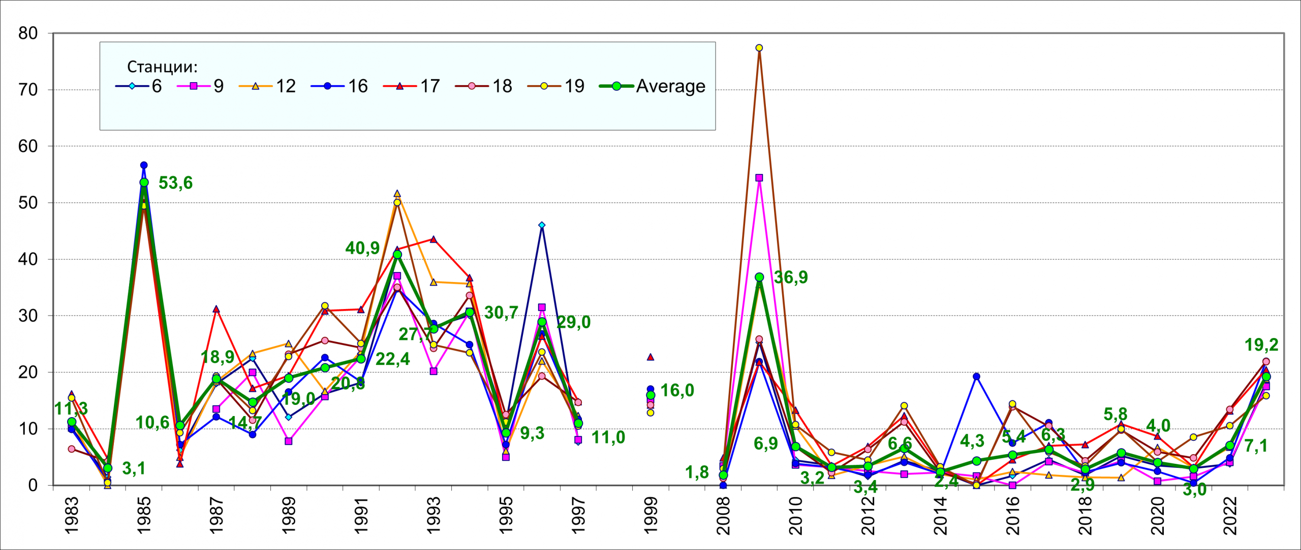 Многолетняя динамика аммонийного азота показывает существенное снижение значений в течение последних двух десятилетий и стабилизацию его содержания на очень низком уровне в районе десятитысячных долей ПДК для морских вод (2239 мкг/дм3).