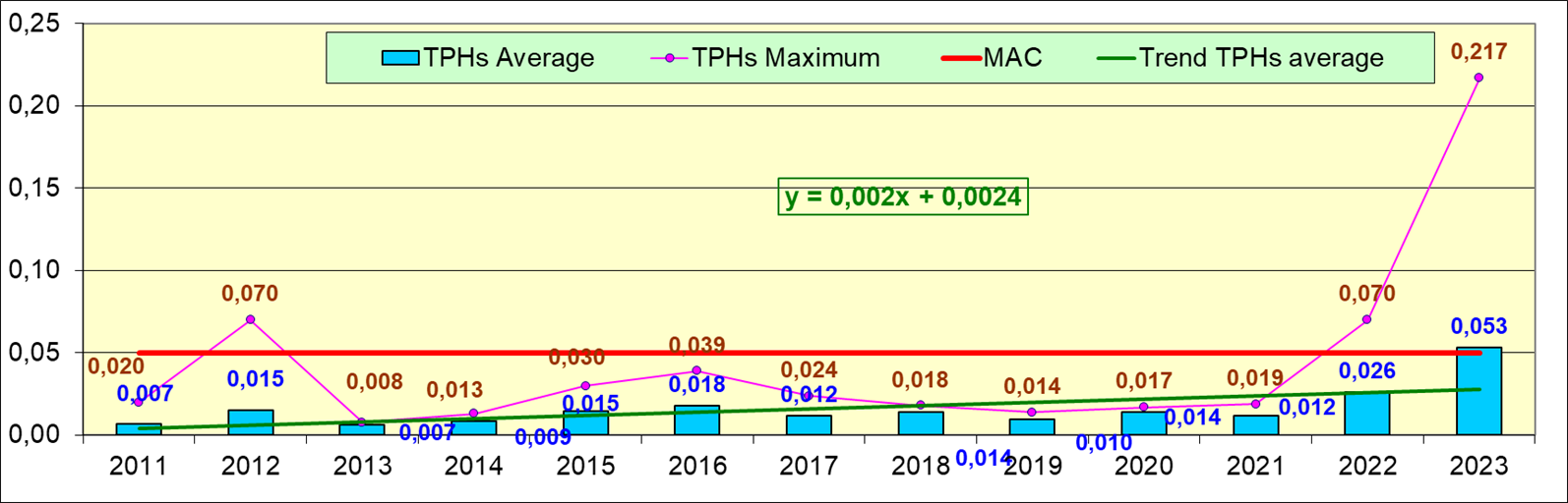 До 2000 г. средние значения содержания нефтяных углеводородов почти постоянно достигали или превышали 1 ПДК. Начиная с 2008 г. концентрация НУ в водах Двинского залива существенно снизилась. В этот период средняя величина обычно составляла менее половины норматива. Однако экстремальные «выбросы» в отдельных пробах достигали значений порядка 1-2 ПДК. Максимум за период 2008-2023 гг. – 2,48 ПДК – был достигнут в 2023 г.